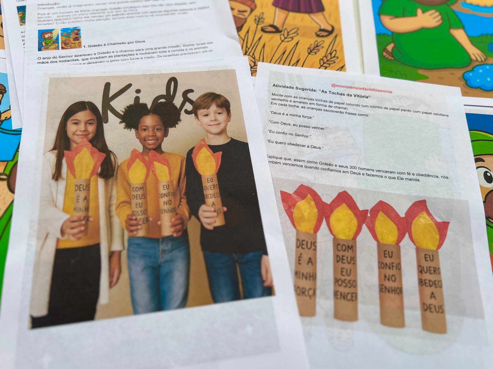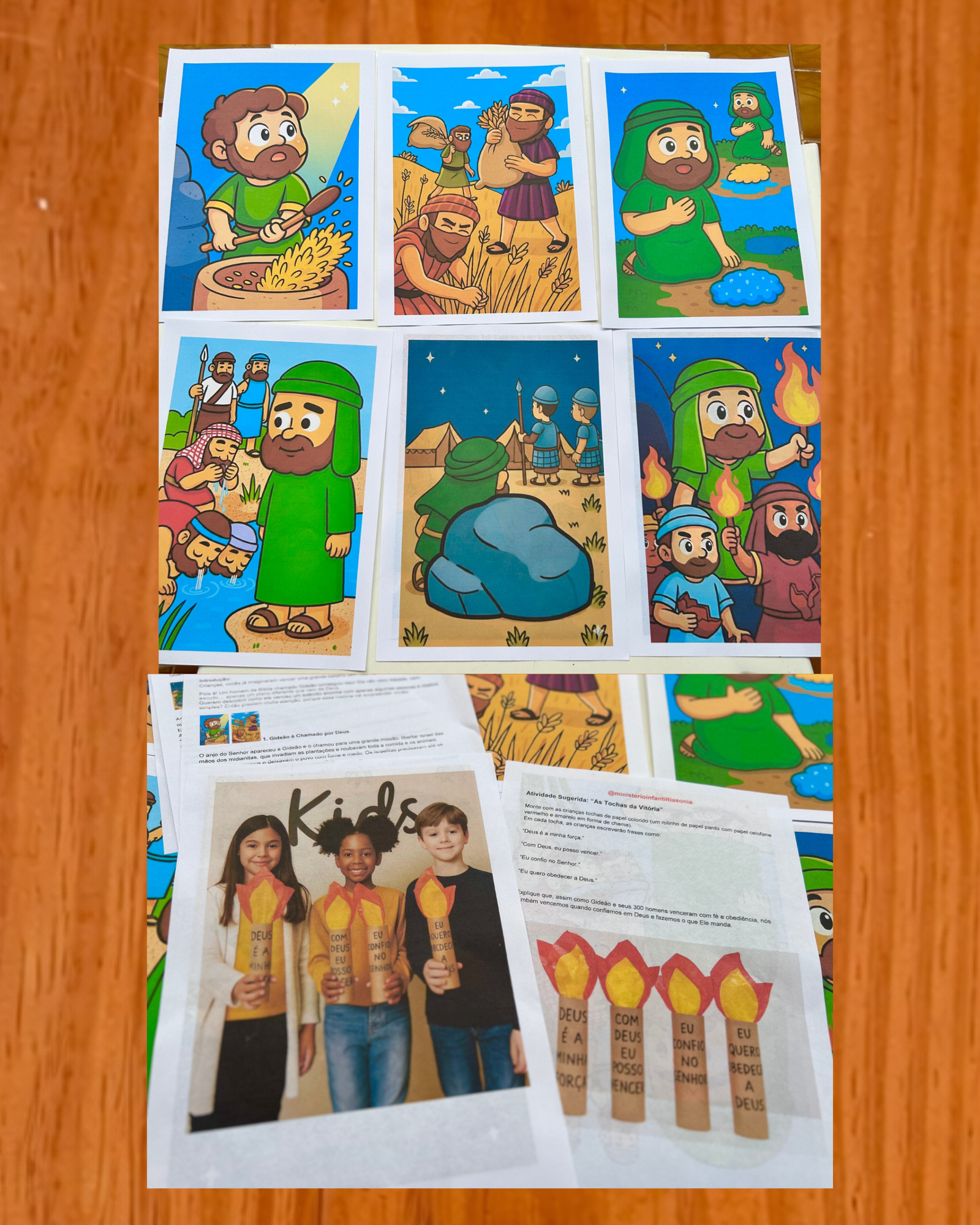 A lição apresenta a história de Gideão de forma envolvente, mostrando como Deus o chamou mesmo em meio ao medo e à insegurança, confirmou Sua promessa e trouxe uma grande vitória com apenas 300 homens, usando tochas e trombetas. As crianças aprendem que confiar em Deus traz coragem, milagres e vitórias inesperadas.