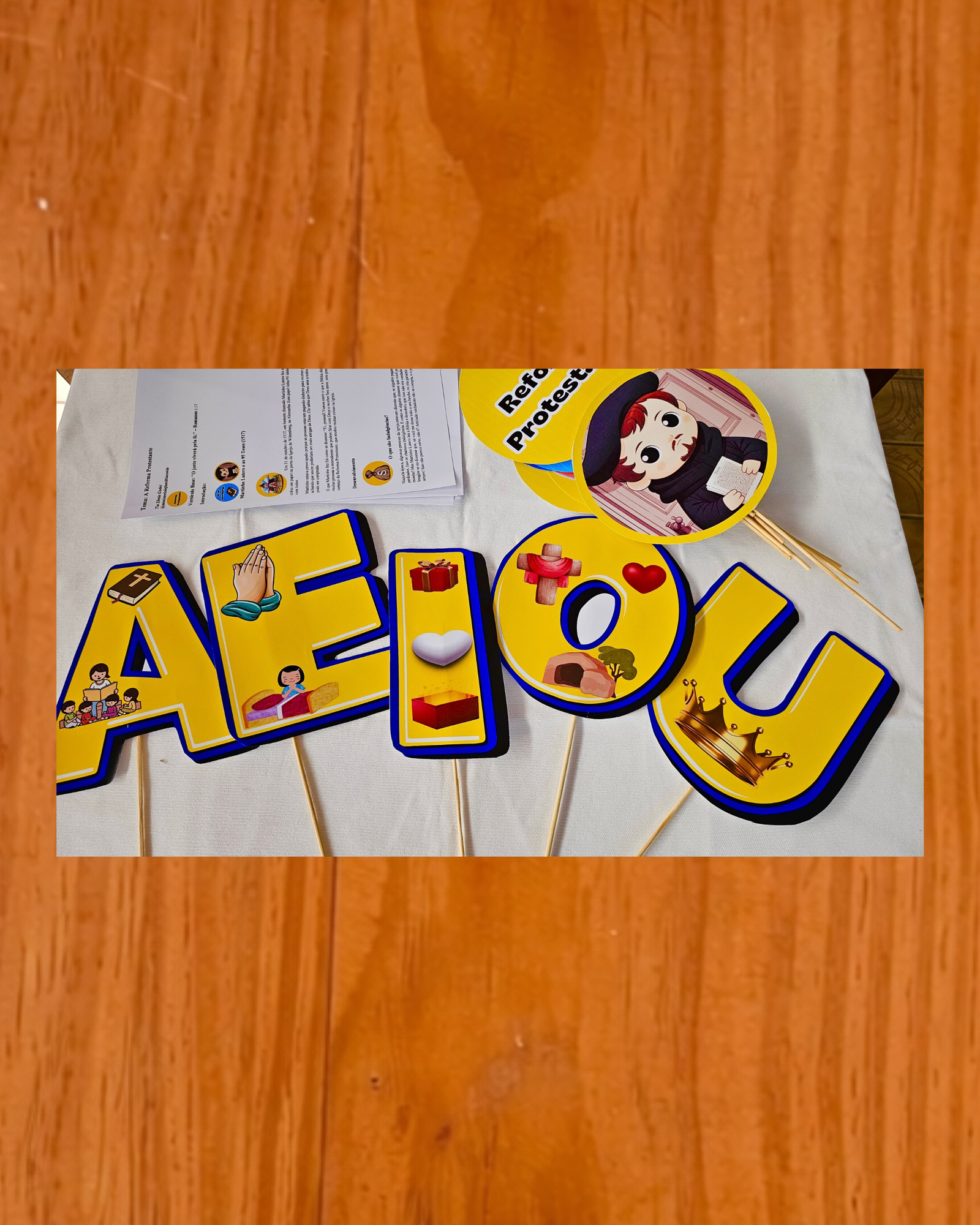 O material também inclui um poema educativo, que ensina as 5 Solas usando as vogais, ajudando as crianças a memorizar de forma lúdica e criativa.